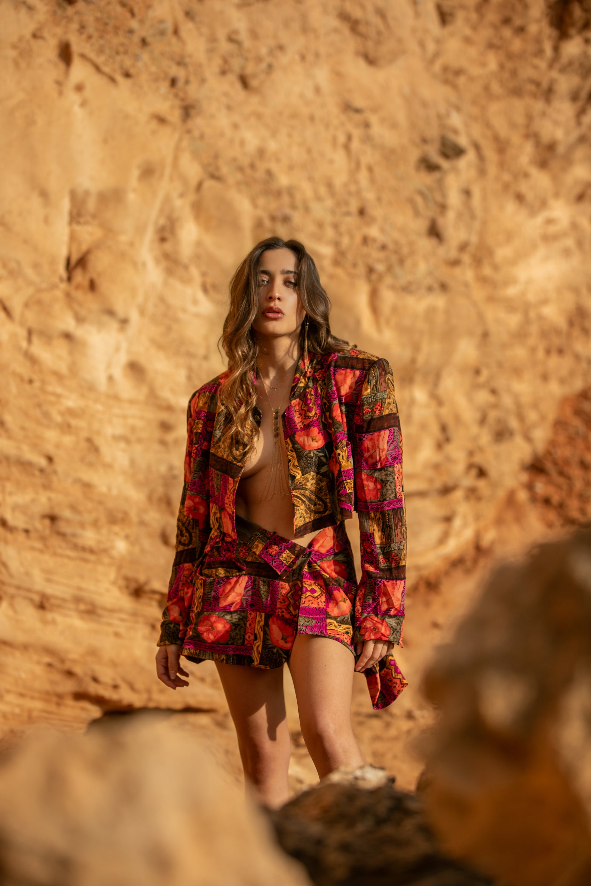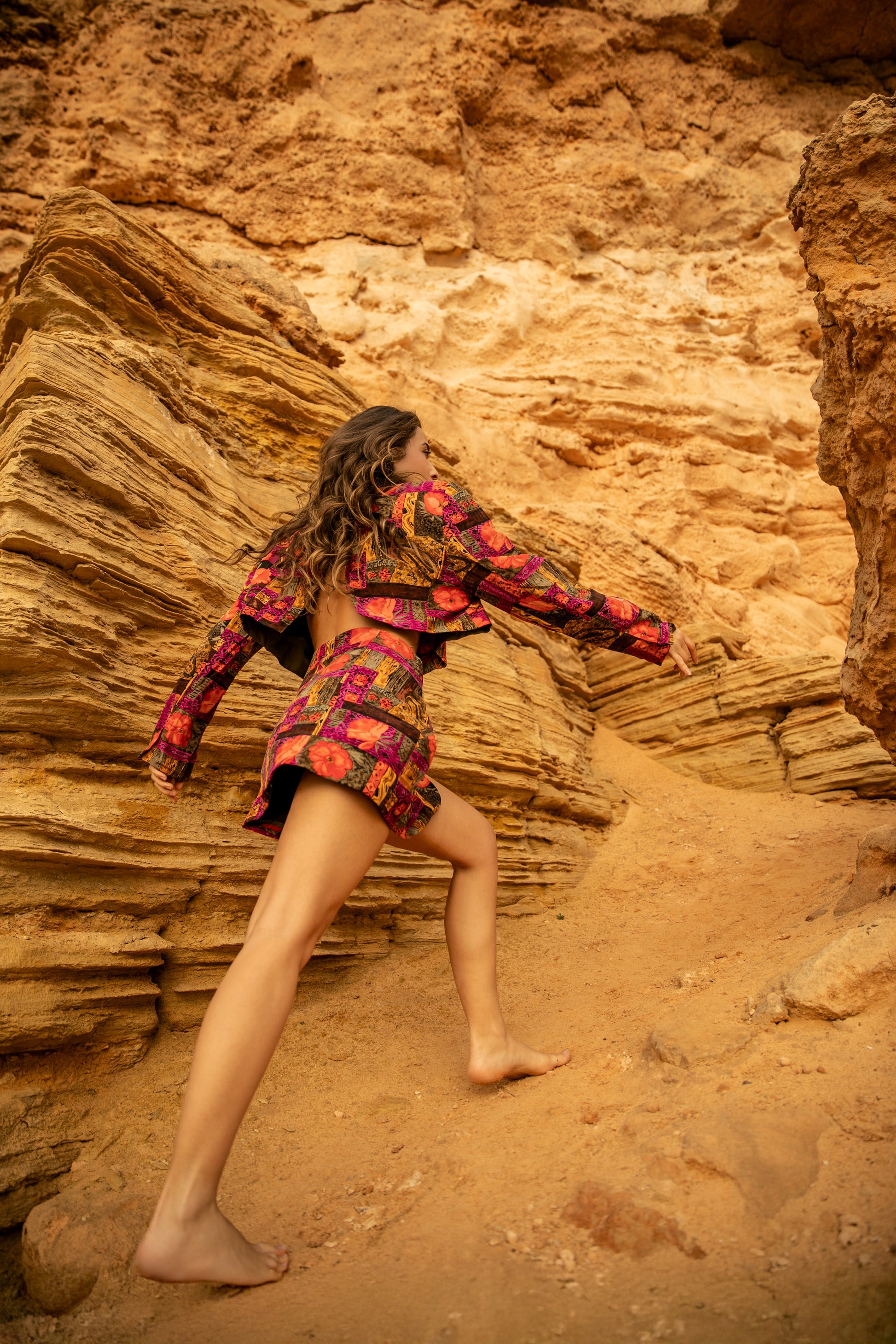 The Athena Set is an elevated, made-to-order design that honors strength, self-expression, and sensual elegance. This striking two-piece silhouette features a structured crop jacket with an open back unexpected, confident, and full of presence paired with an asymmetrical wrap-style mini skirt that moves with intention.