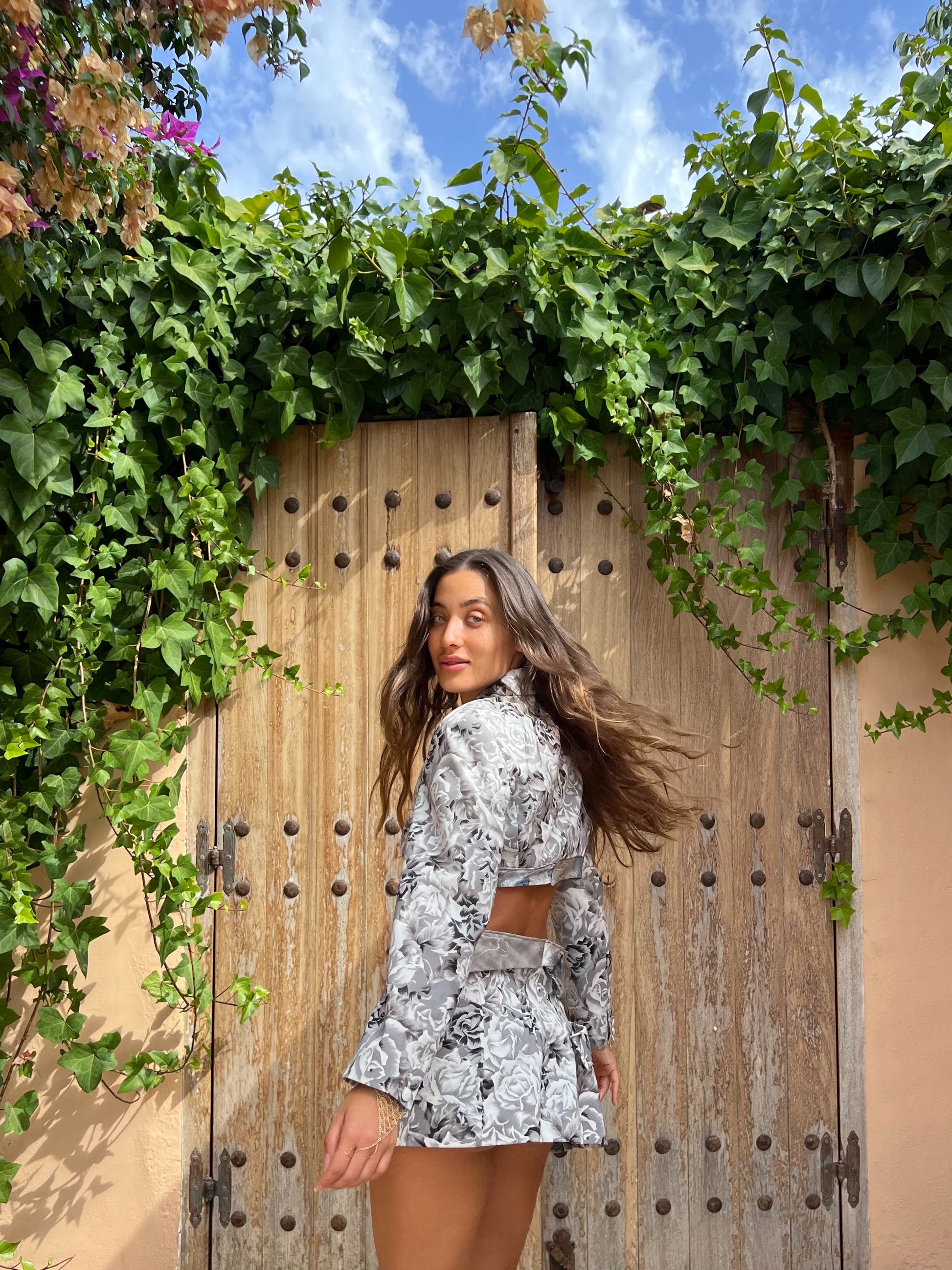 A one-of-a-kind set crafted from floral patterned fabric with a subtle sheen. The cropped jacket carries a sharp silhouette, finished with soft silk trims at the edges, while the low-rise mini skirt is sculptural and playful, with asymmetric cut-outs, silk bands at the thigh, and pocket details. Elaria is bold and refined — a statement for both day and night.
