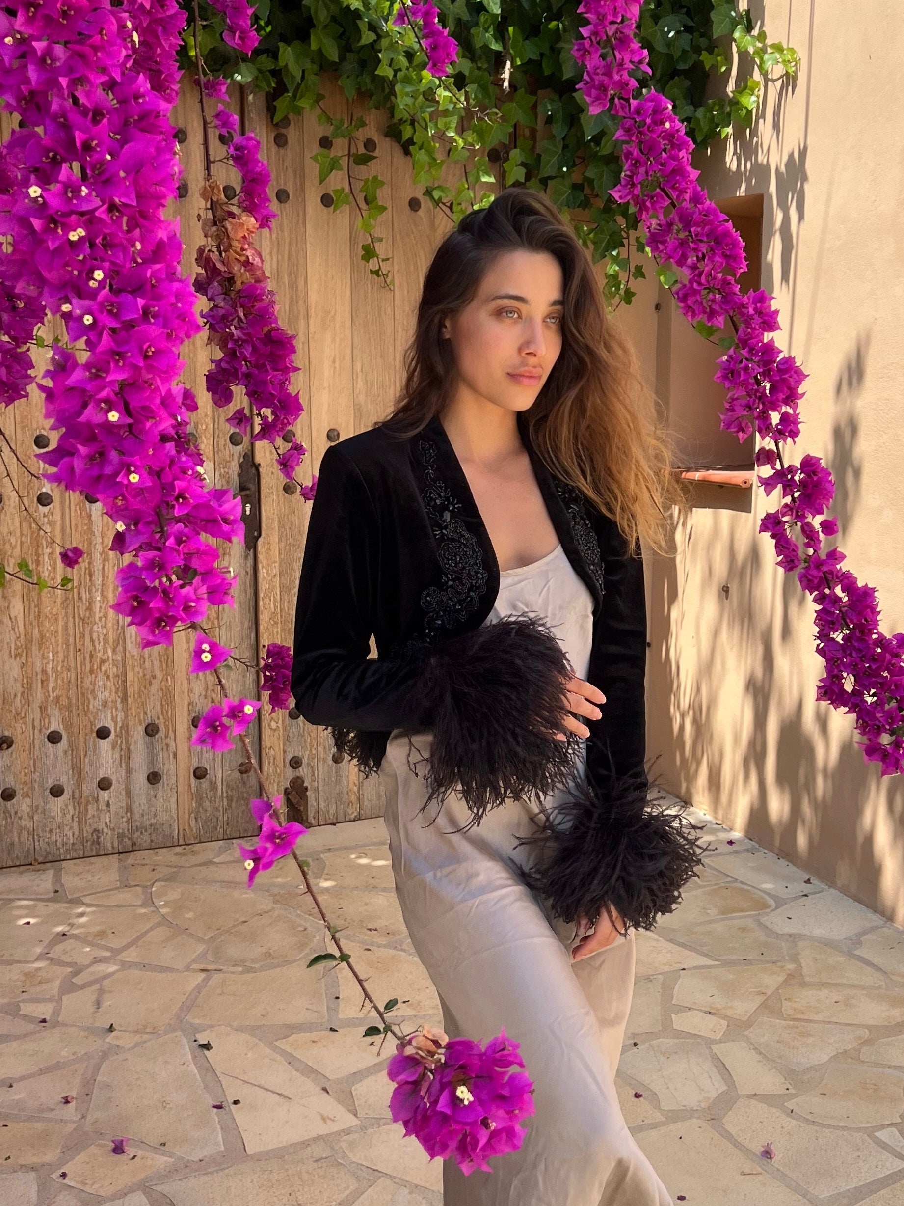 Crafted from black velvet with intricate hand-beaded embroidery across the chest, and finished with dramatic feather-trimmed cuffs, she’s made to awaken your inner sorceress.